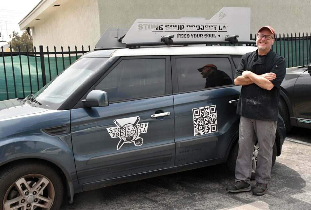 So in April 2020, Weinroth established Stone Soup Project LA, where he is, for the most part, a one-man show calling himself chief bottle washer, lead alchemist and chef, community outreacher, VP of soupy sales and Soupmobile pilot. Yes, he personally delivers customers’ soup directly to their doors.