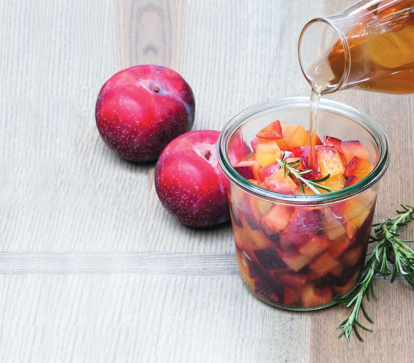 - Place chopped fruit in a bowl and lightly crush using a potato masher or fork. Combine fruit, its juices and any herbs or spices in a sterilized quart jar. Pour vinegar into jar, making sure ingredients are completely submerged.