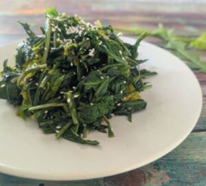 Use the leaves. Note: Boil for 5 to 10 minutes to reduce bitterness.