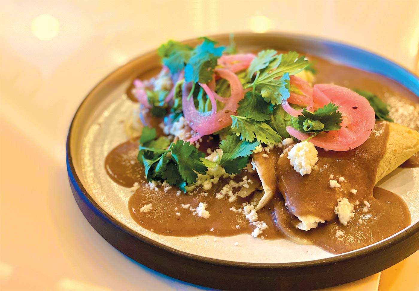 - Pour the bean sauce over the top of the filled tortillas and garnish with cilantro, queso fresco, avocado and pickled red onions and serve.