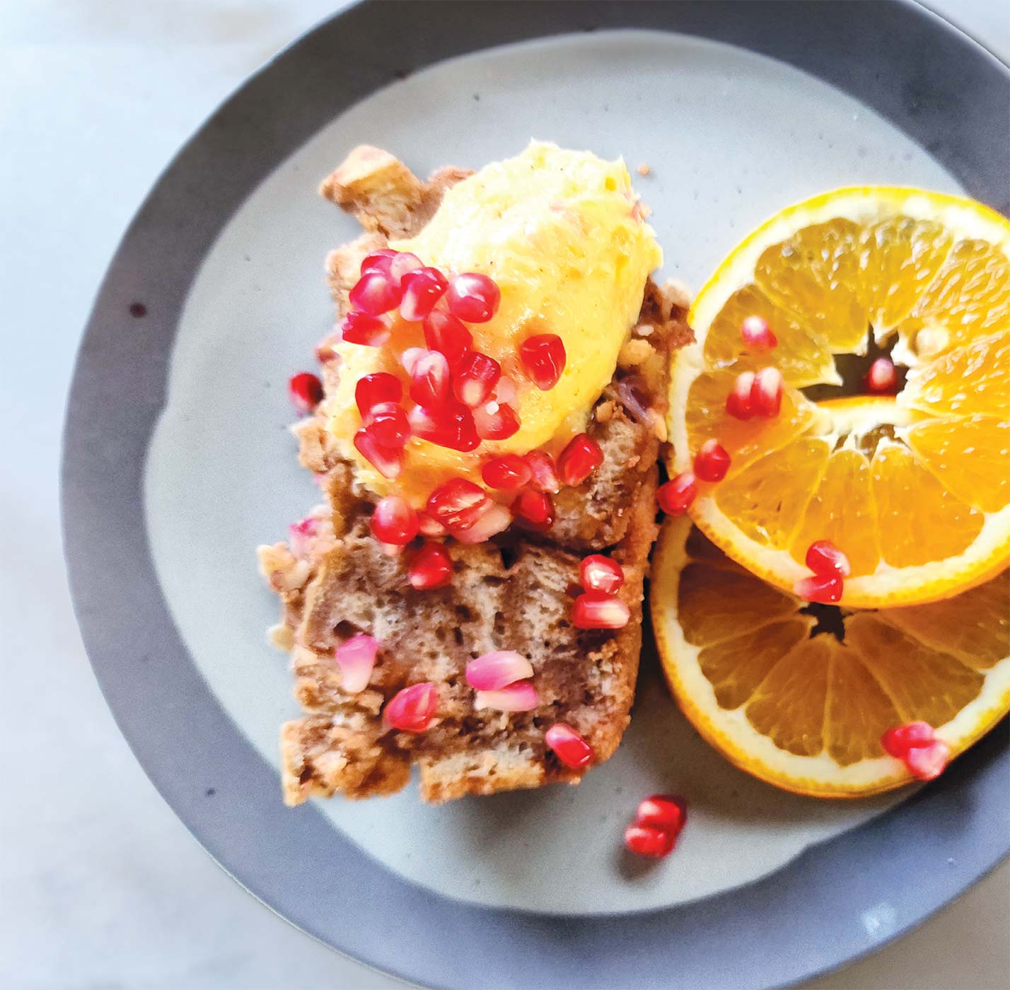 - To serve, cut warm bread pudding into slices and top with 1 to 2 tablespoons Pomegranate-Orange Butter.