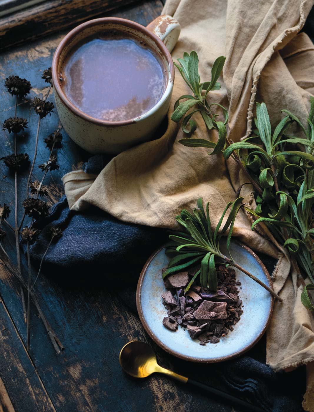 - Strain out the leaves and add cacao and honey. Combine thoroughly with an immersion blender or in a high-speed blender.