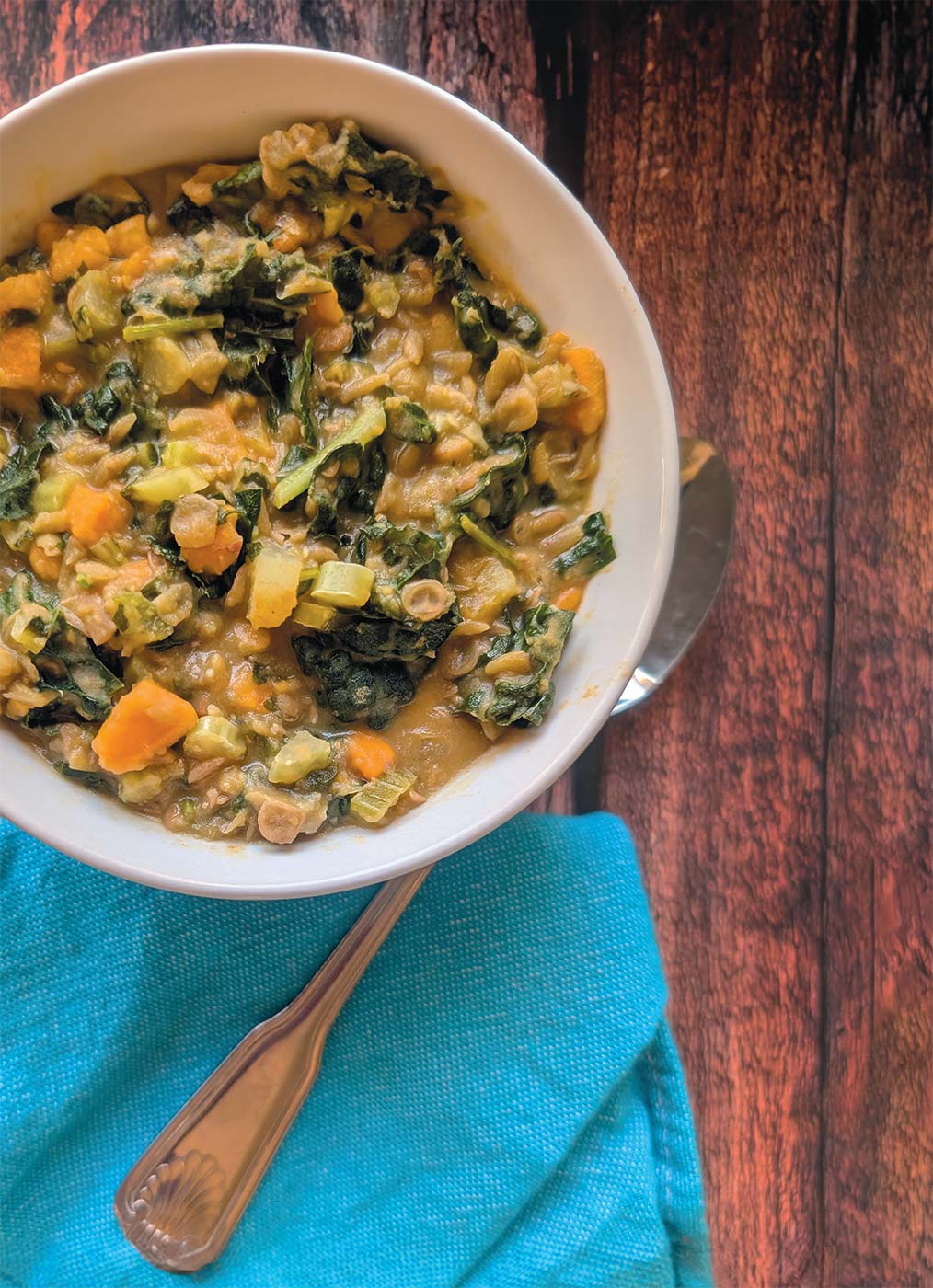 - Once lentils are soft, add celery, carrots, sweet potato, kale stems and ginger (if using); add more liquid, if needed. Cook vegetables until soft, about 15 minutes.