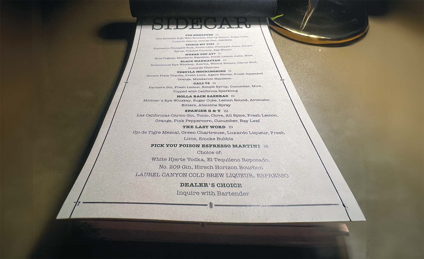 The Sidecar has an expansive, upscale alcohol menu of single spirits, beer, wine and wow-worthy cocktails. The Signature, the house Old Fashioned, uses Otto Bothwell High West Bourbon (a collab with the Park City, Utah, distillery) and smoked with cherry wood. The Last Word is spiked with Ojo de Tigre Mezcal, green Chartreuse, Luxardo liqueur and fresh lime. A smoke-filled bubble is the impressive drink topper. And there’s always a Dealer’s Choice (ask the bartender).