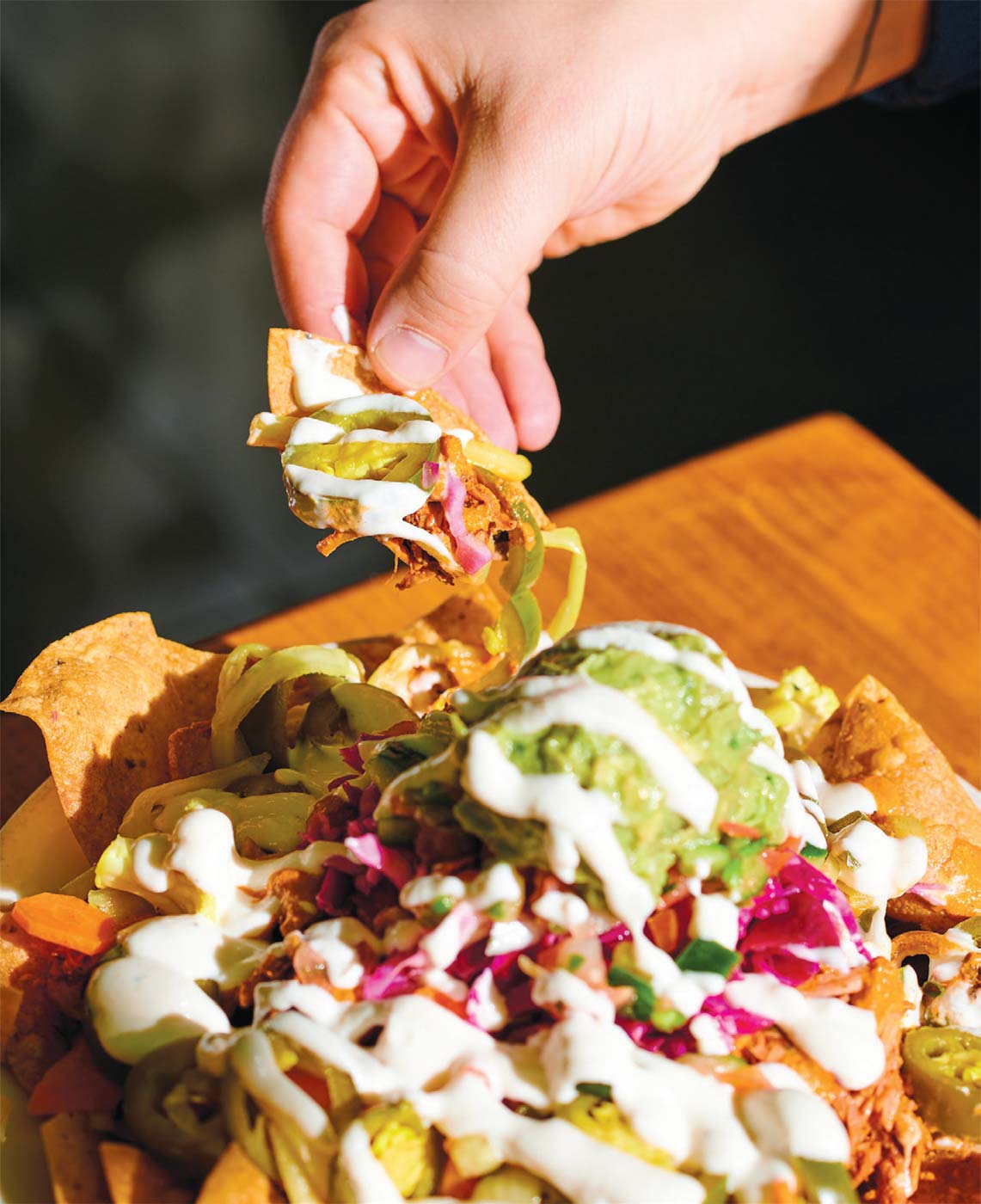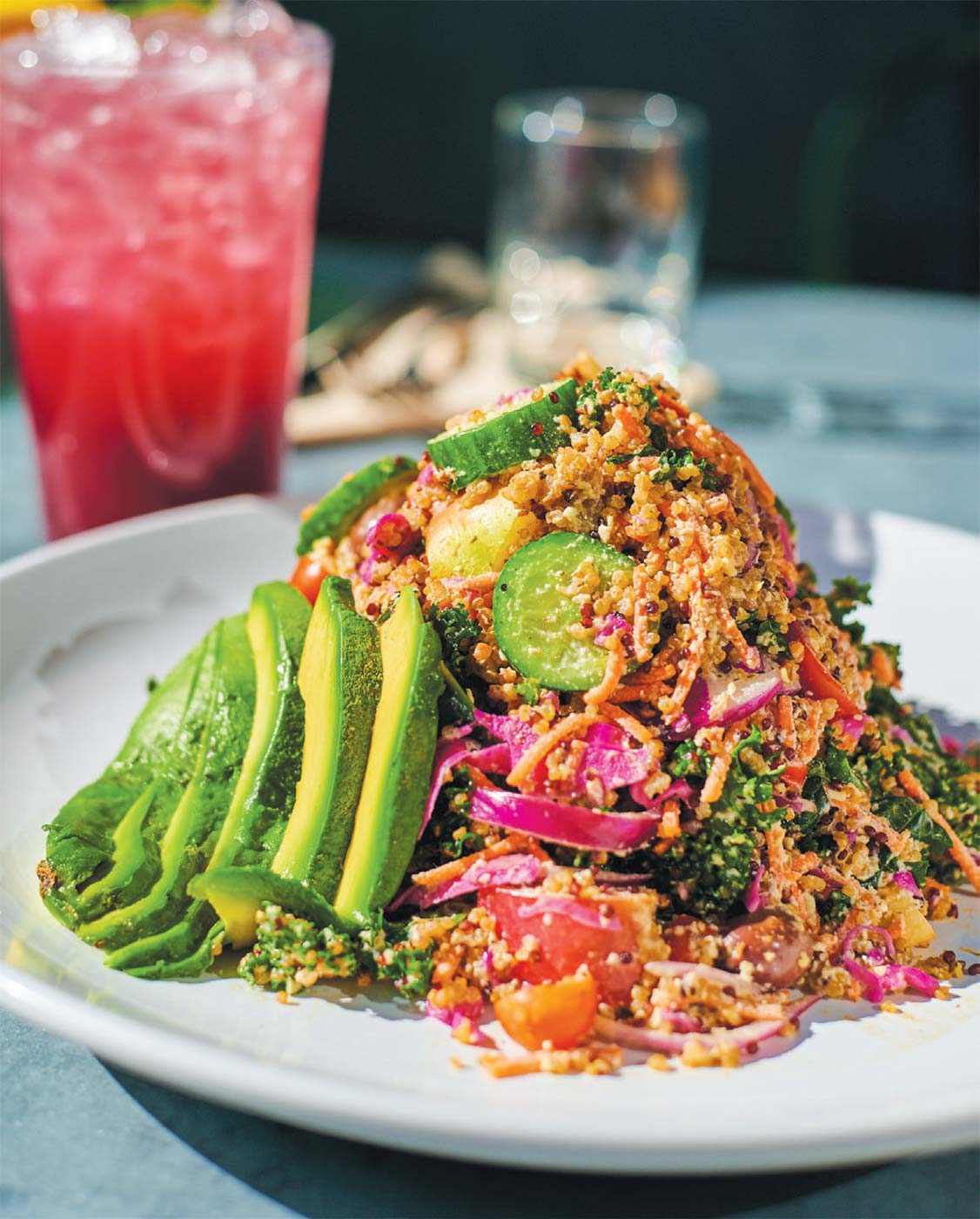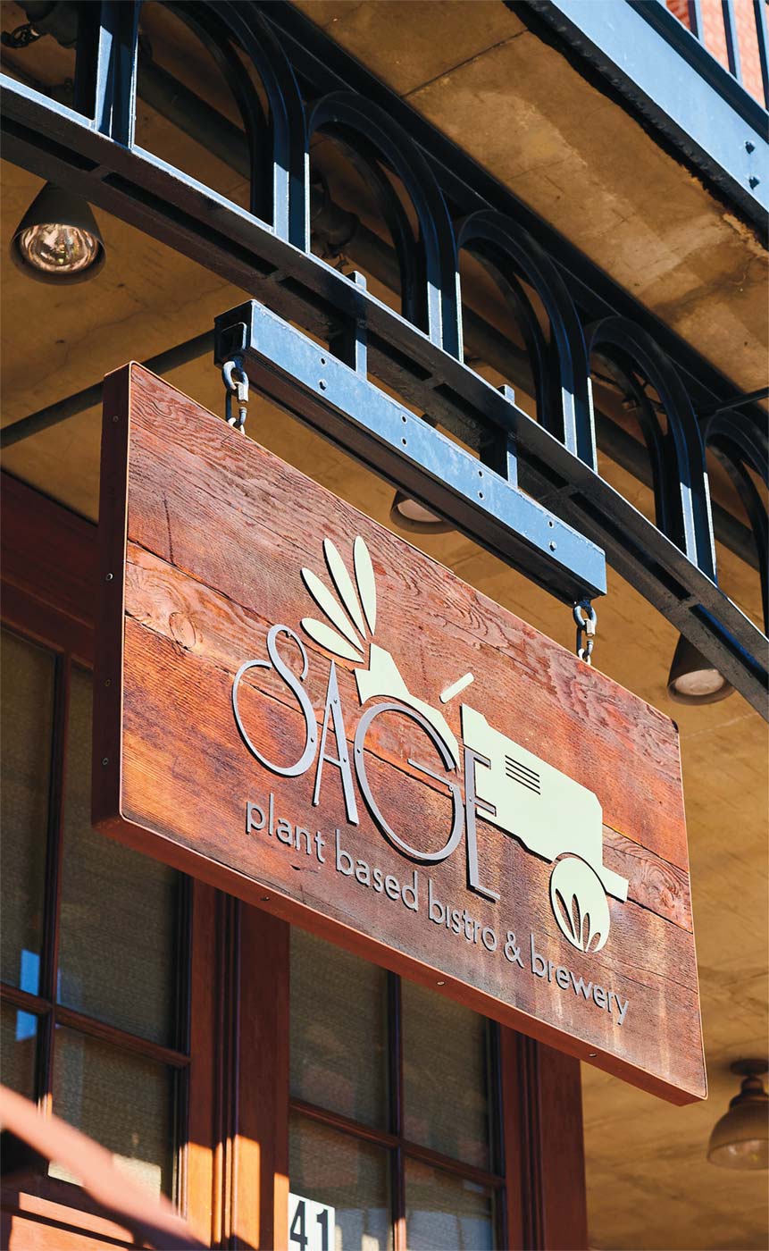 I am largely resigned to my lot in life being meager menu selections, but Sage, whose plant-based offerings rival the legendary proportions of Th e Cheesecake Factory’s spiral-bound beast, is a welcome respite. And we’re not just talking run-of-the-mill vegan fare. Yes, there are the requisite salads and smoothies and bowls, but there are also share plates, pizzas, entrées, tacos and sides— enough to cover both sides of the placemat-size menu.