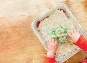 “This smells wonderful!” I say, peering into a pot of sauce that bubbles with bright red tomato-y goodness. I’m here this morning to help Klinenberg make multiple trays of the classic layered cheese and noodle dish that she’ll deliver this afternoon to food-insecure families and individuals.